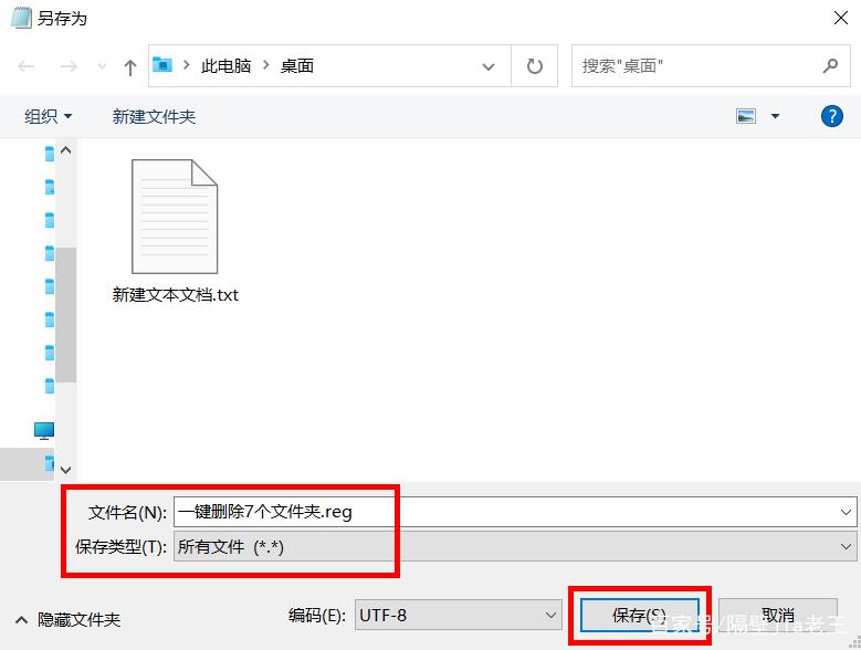 3、单击右上角的另存为...,在弹出的窗口中将文件名改为一键删除7个文件夹.reg,然后保存类型选择所有文件(这一点必须要做对,否则可能会失败!),最后单击保存按钮。如下图所示: