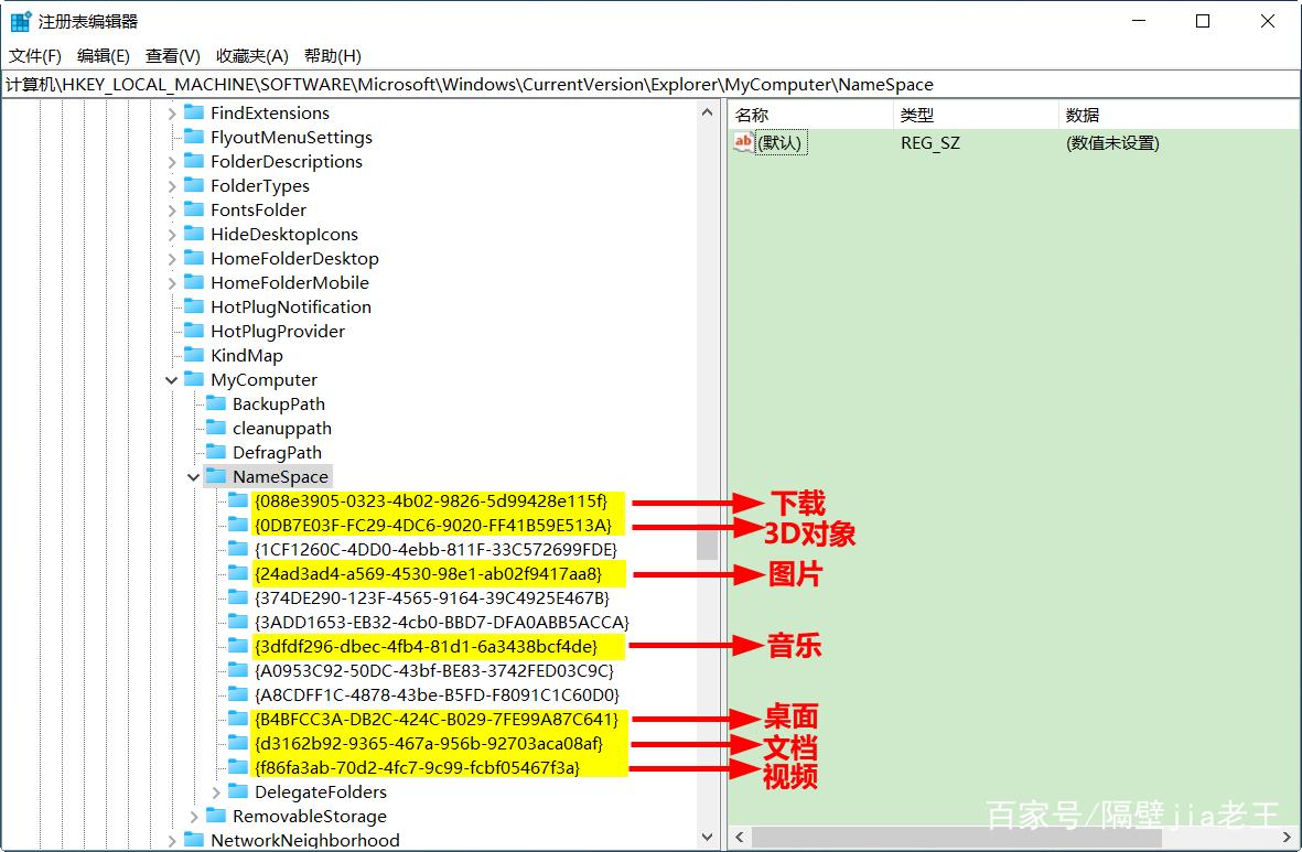 2、将此地址:计算机\HKEY_LOCAL_MACHINE\SOFTWARE\Microsoft\Windows\CurrentVersion\Explorer\MyComputer\NameSpace,复制粘贴到注册表编辑器上部的地址栏内,按Enter键,系统会自动定位到此位置。此时,我们会看到很多代码。每行代码代表不同的文件夹,具体含义如下: