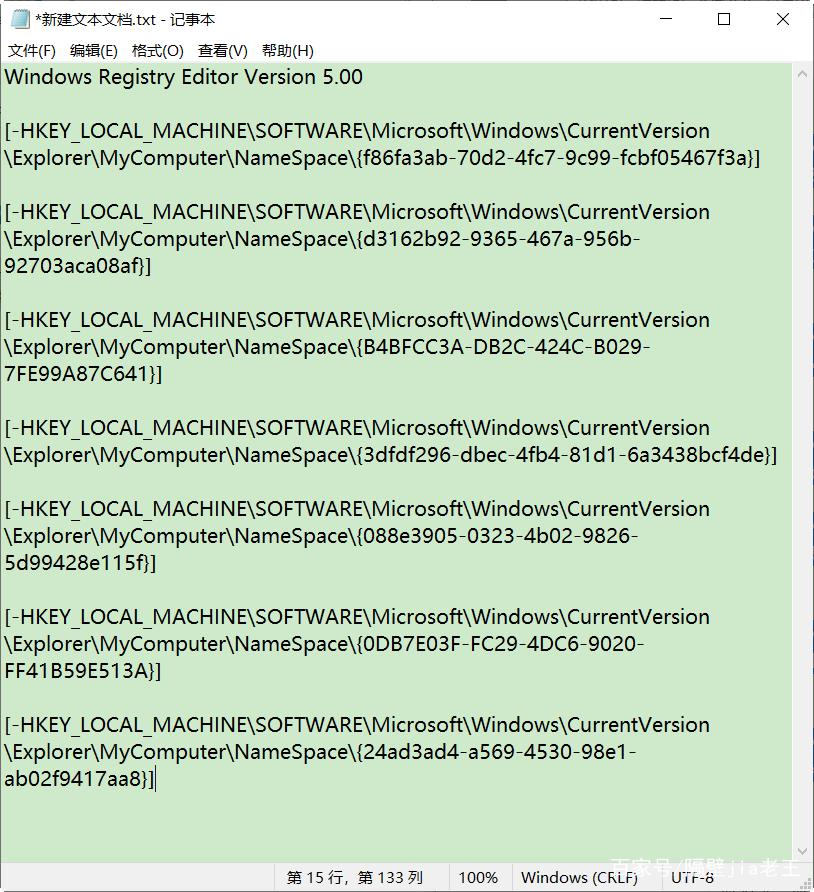 其实恢复的方法和删除的方法类似,同样需要新建一个文本文档,然后直接将下面的代码复制粘贴进来: