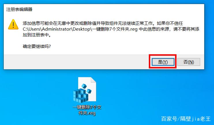 4、双击一键删除7个文件夹.reg注册表文件,弹出一个对话框,然后单击是,系统会再次出现一个对话框,再单击确定即可。