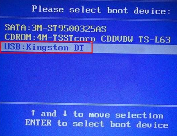 选择U盘选项后回车进入下一步,注意:通常带有“USB”字样的选项即为U盘选项