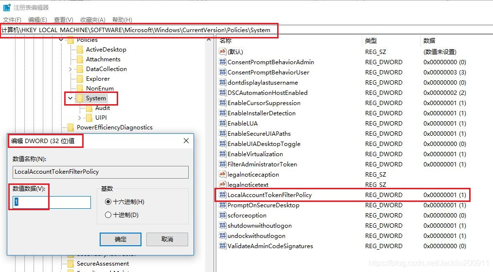向其中新建DWORD(32位)值(D),数值名称为LocalAccountTokenFilterPolicy,数组数组设为1。