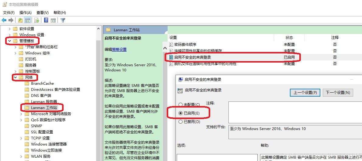 依次打开“管理模板”->“网络”->“Lanman 工作站”->“启用不安全的来宾登录”,勾选“已启用”,并确定。