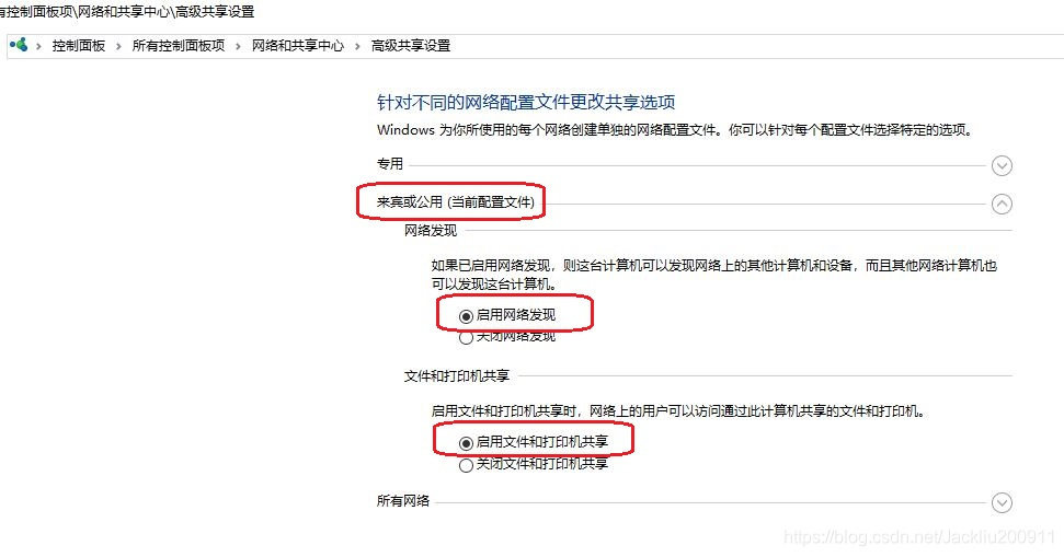2、更改高级共享设置,选择“来宾或公用(当前配置文件)”,勾选“启用网络发现”和“启动文件和打印机共享”
