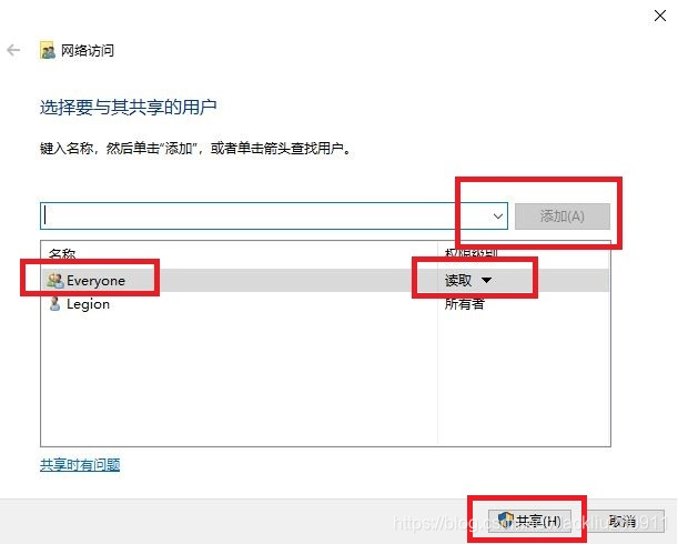 10、点击“共享”,设置网络访问,从下拉框中选择“Everyone”,点击“添加”,